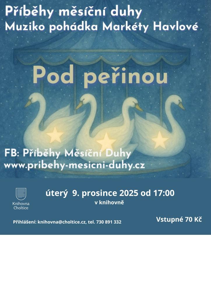 Mgr. Markéta Havlová přiveze pohádku "Pod peřinou" z Příběhů měsíční duhy. Po skončení pohádky možnost vyzkoušení různorodých nástrojů včetně bubnů. Vstupné 70 Kč. Děkujeme za přihlášení v knihovně.