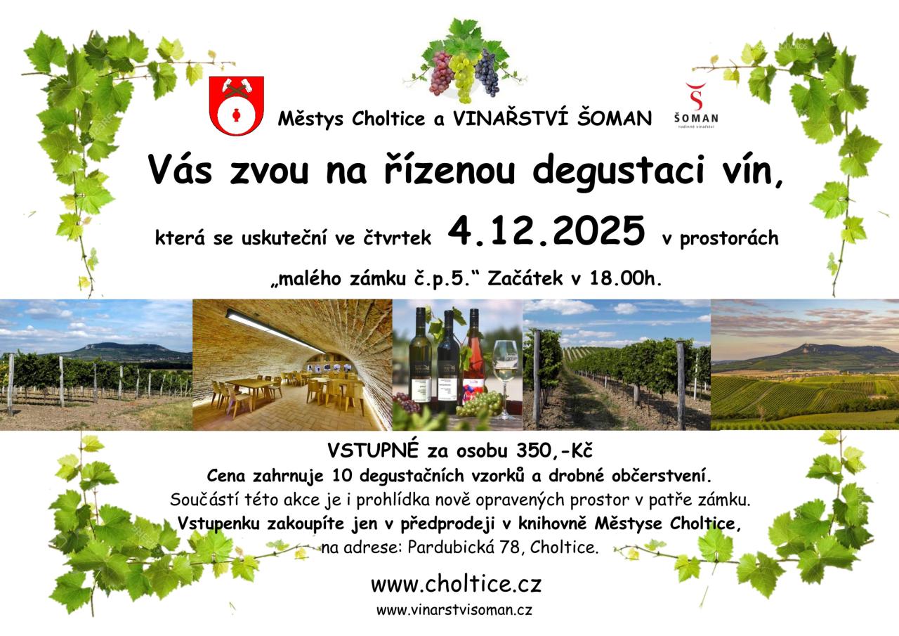 Městys Choltice a vinařství ŠOMAN Vás zvou na řízenou degustaci vín 4.12.2025 v prostorách malého zámku č.p. 5 od 18 hodin.