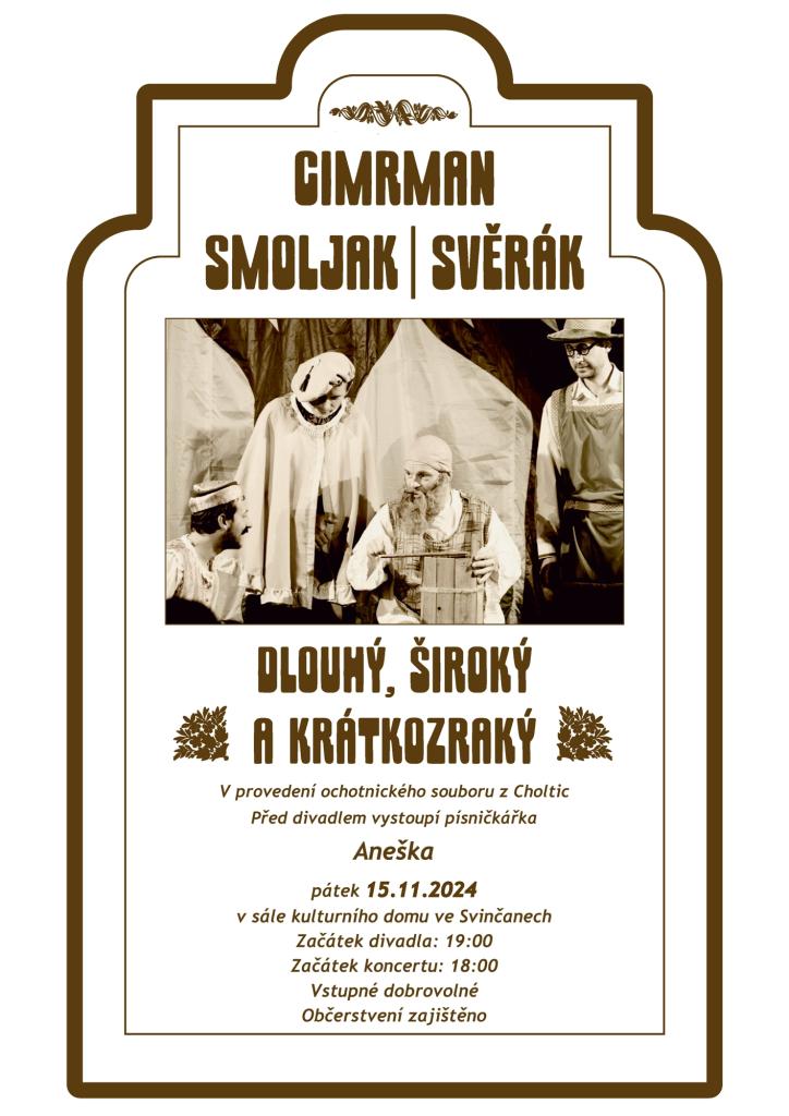 Spolek Deštník Vás zve na divadelní představení Dlouhý, široký a krátkozraký z pera trojice Cimrman, Smoljak Svěrák. Těší se na Vás choltičtí ochotníci v kulturním domě ve Svinčanech od 19hod. Od 18,00 hodin zahraje a zazpívá pisničkářka Aneška. Vstupné dobrovolné, občerstvení zajištěno .